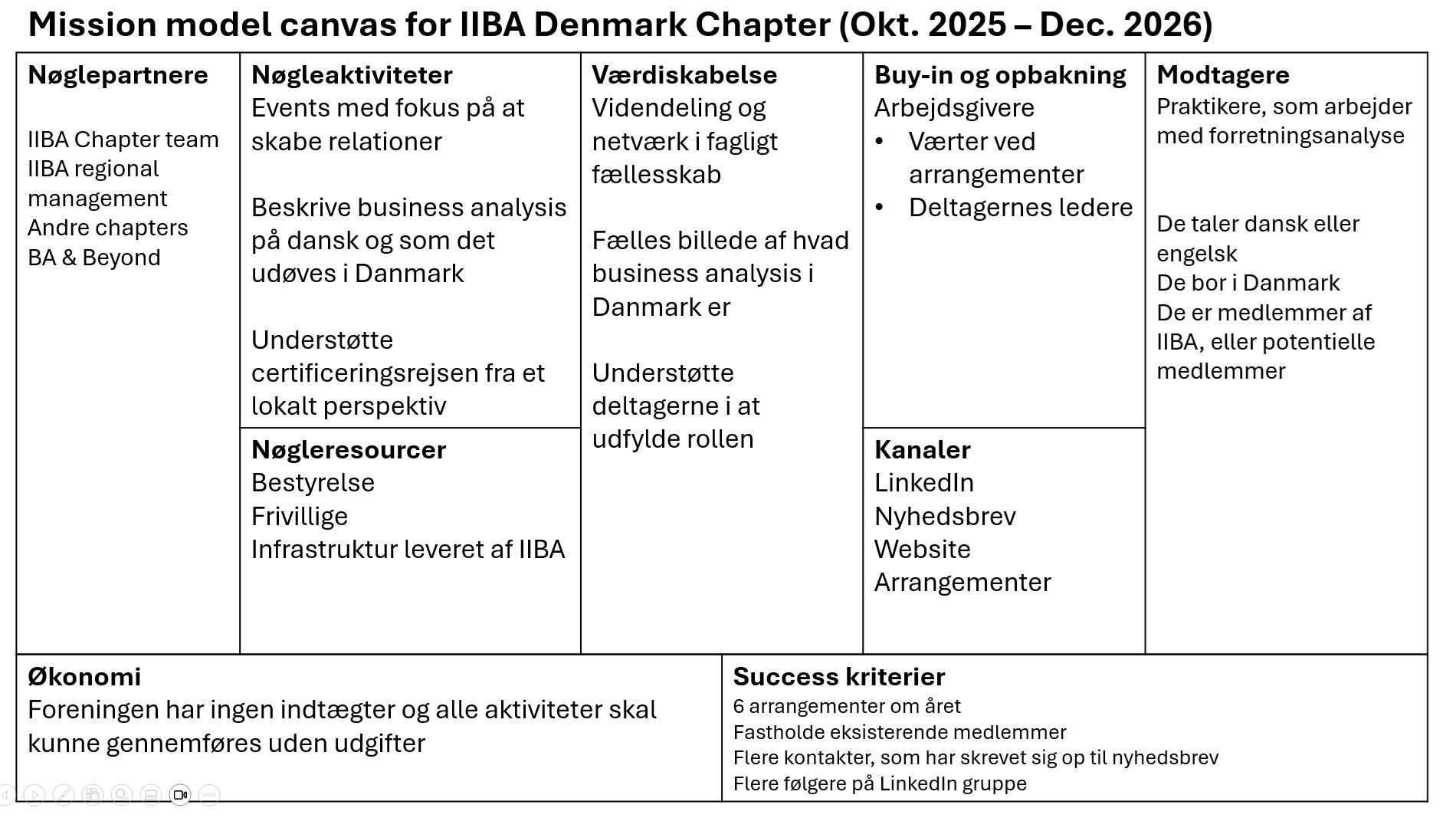 IIBA Denmark Chapter blev etableret i maj 2025 og er foreningen for alle, der arbejder med eller interesserer sig for forretningsanalyse i Danmark. Foreningen er stadig i opstartsfasen, og bestyrelsen har derfor arbejdet på at sætte en klar retning for, hvordan foreningen kan skabe værdi for medlemmer og deltagere.
